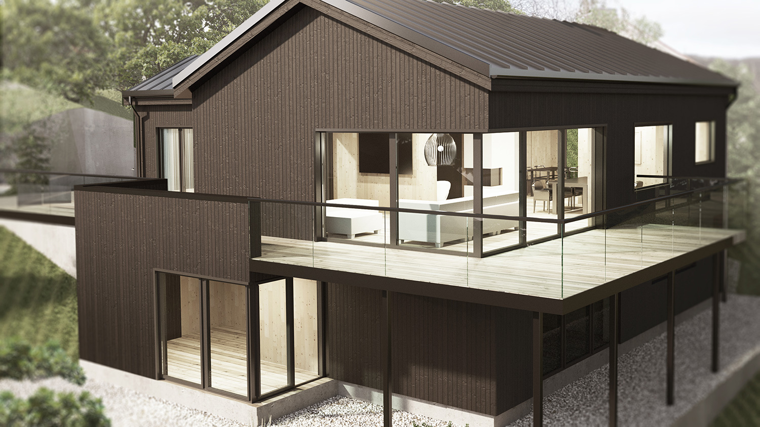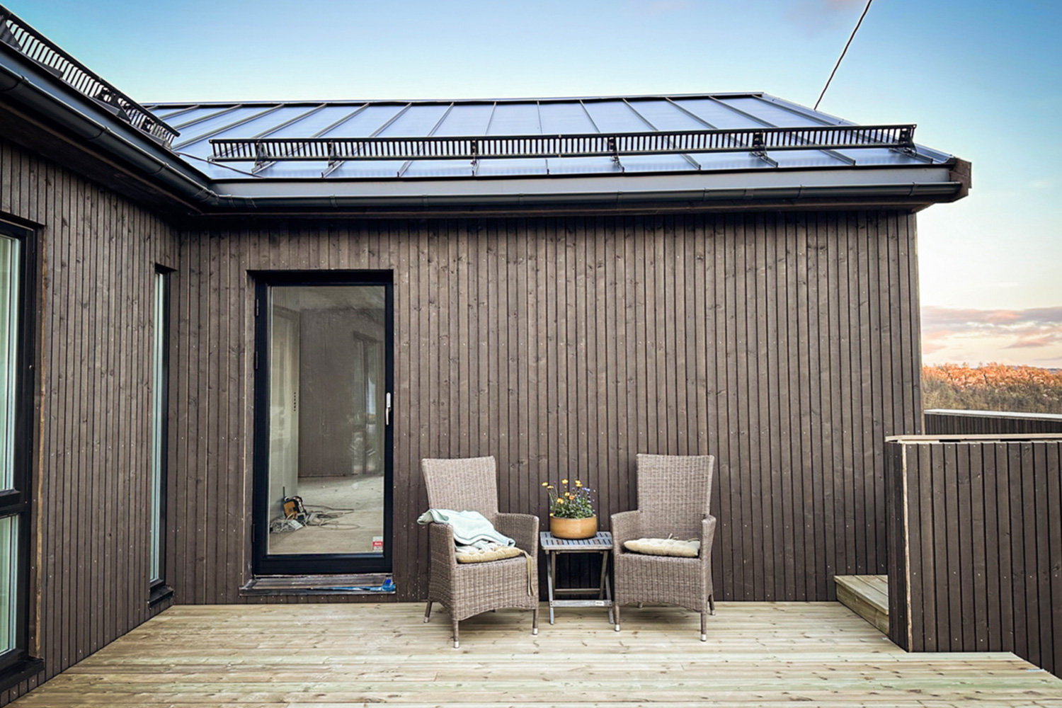Den nye fasaden viderefører den mørkebrune trekledningen, mens mursokkelen kles inn med trekledning, for å gi et strammere uttrykk. De store glassvinduene i fasaden og det mørke taket er med på å modernisere utrykket ytterligere. Likevel ivaretas hovedformen, terrengtilpasningen og takformen, i lik stil som naboeiendommene.