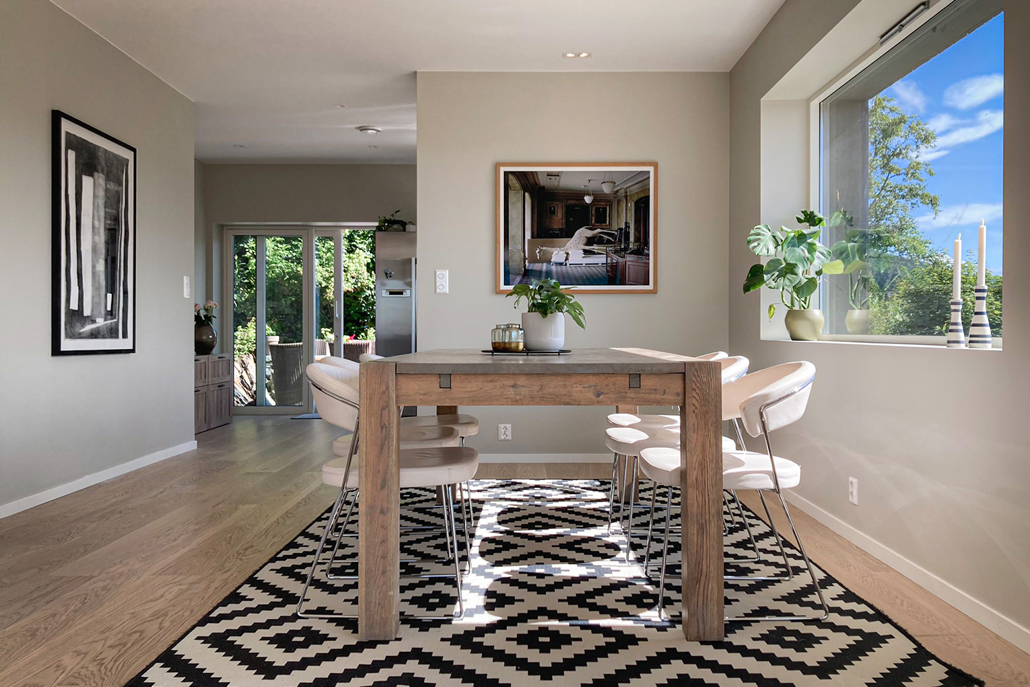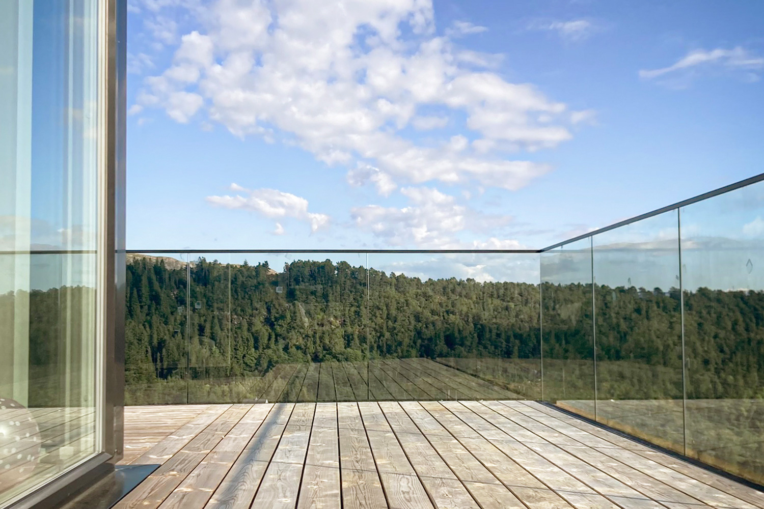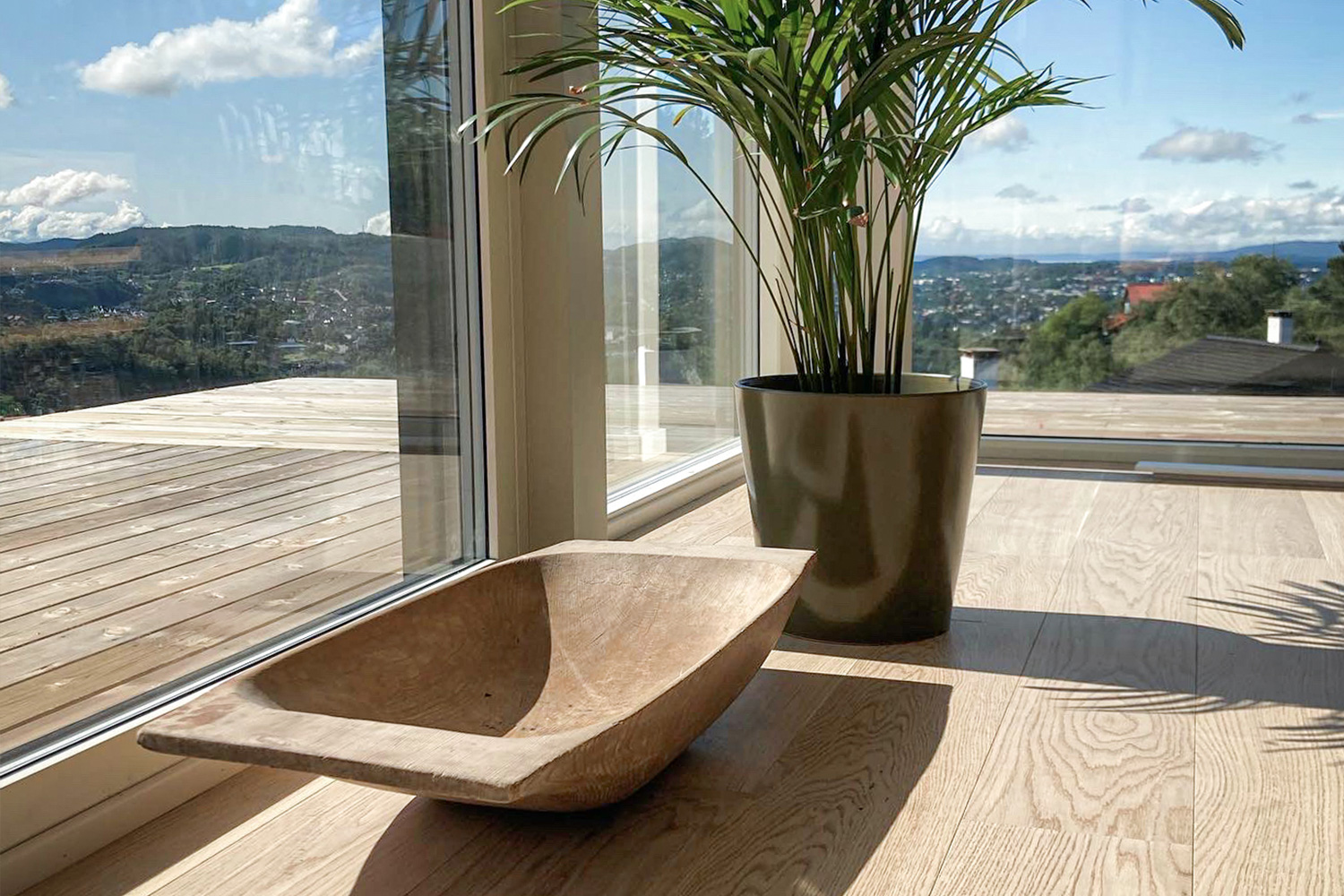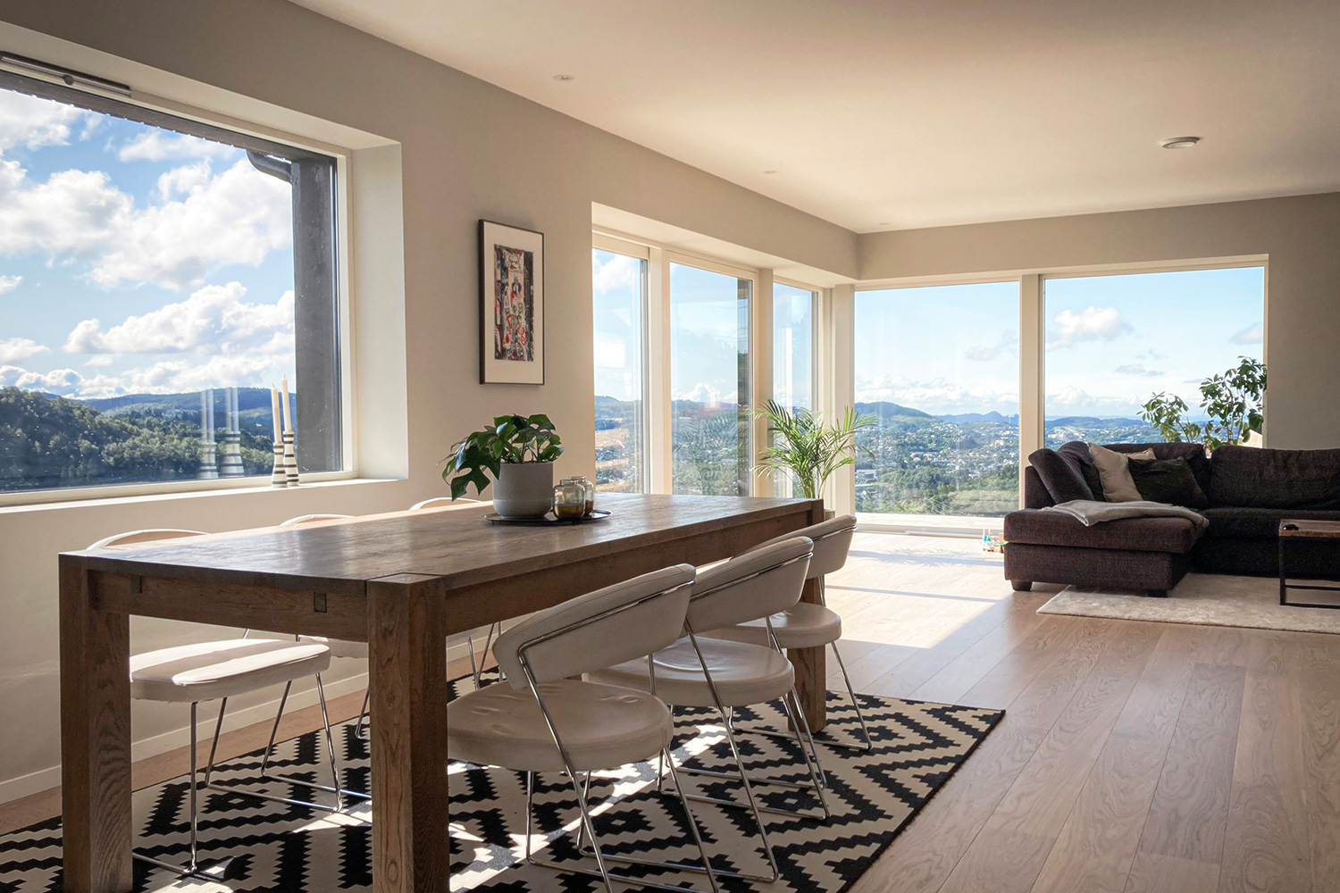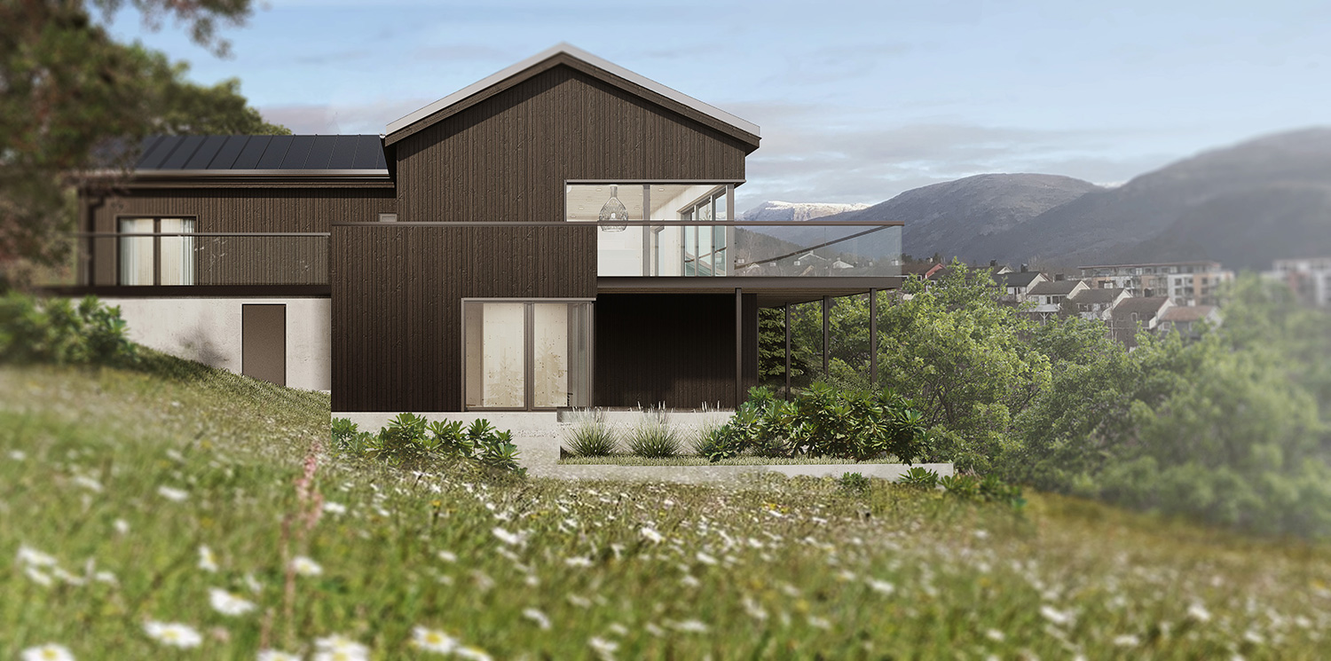 Idéen bak rehabiliteringen av eneboligen var å ivareta planløsningen som den er, mens fasaden moderniseres, og åpnes opp mot utsikten som strekker seg fra fjelltoppene i øst til sjøen i sørvest.
