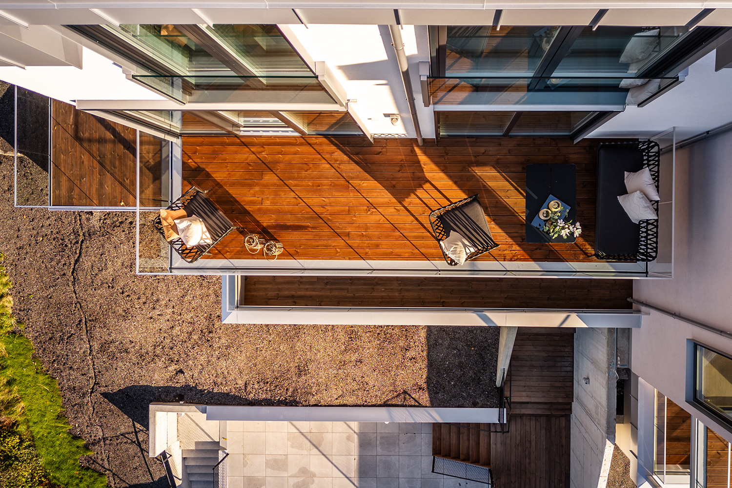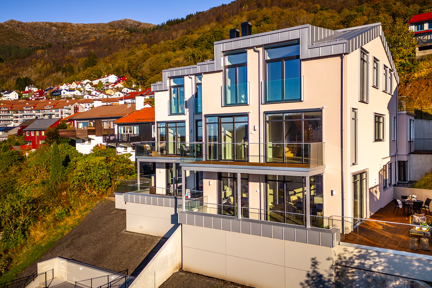 Leilighetsbygget i Terneveien har vært et prosjekt der vi bygget videre på de karakteristiske omgivelsene på Landås, samtidig som vi ville tilføre et moderne og nytt innslag i nabolaget. Utformingen av bygget baserer seg på tolkning av rekkehusbebyggelsen i det historiske boligstrøket langs Terneveien og Landåslien, der fasadene er forskjøvet i forhold til hverandre og trapper nedover skråningen. Videre har vi vektlagt et stramt utrykk med pusset fasade, store vinduer og tak- og vindusdetaljer i metall, som gir et elegant og moderne utrykk.